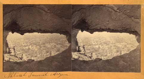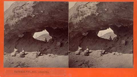 | Stereograph of the Natural Tunnel (Hole-in-the-Rock) at Papago looking into the opening by J. C. Burge ca 1890. Burge cropped out the advertisement for competitor George Rothrock's photo studio in Phoenix painted just to the right of the frame in white paint on the rock wall. | ![]() |